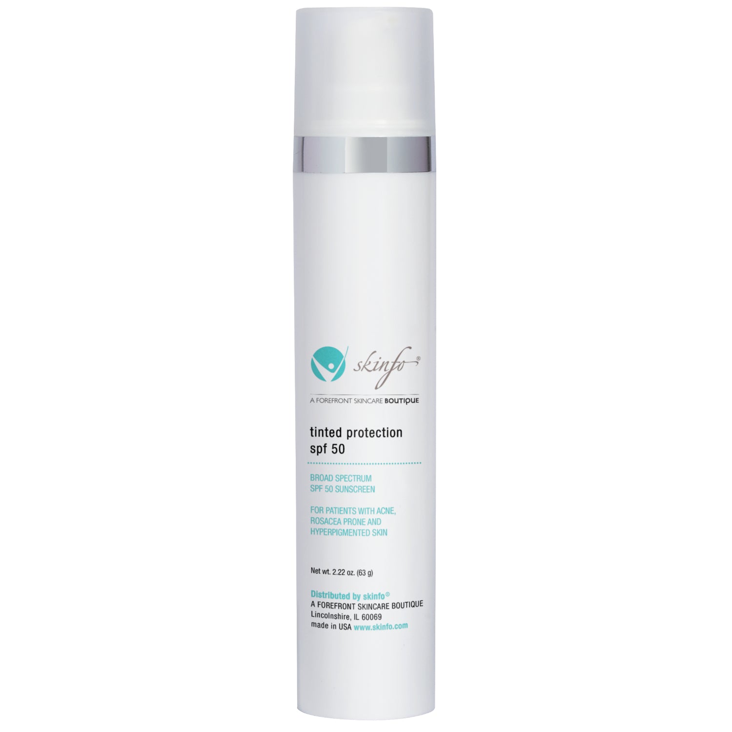 Skinfo Tinted Protection SPF 50 has a universal tint for all skin tones. This sunscreen protects against UVA/UVB  with 14.5% Micronized Zinc Oxide. This sunscreen also contains Antioxidants, Lactic and Hyaluronic Acid plus Niacinamide. Skinfo Tinted Clear Protection SPF 50 is oil free, paraben-free, fragrance-free, non-comedogenic and is sensitive skin friendly. 2.22 oz.